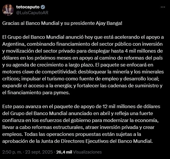 “Gracias al Banco Mundial y a su presidente Ajay Banga!” posteó Caputo en la red social X (exTwitter). El funcionario aseguró que la ayuda económico será “en apoyo al camino de reformas del país y su agenda de crecimiento a largo plazo”.