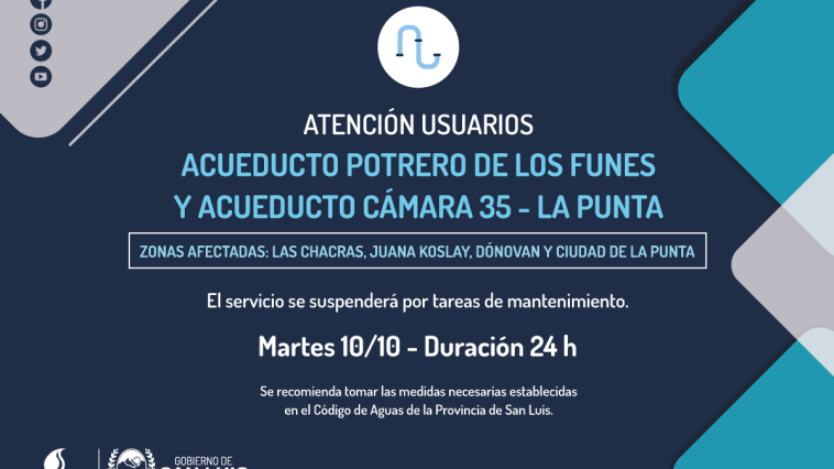 Por mantenimientos, suspenderán el servicio de los acueductos Potrero de los Funes y Cámara 35-La Punta