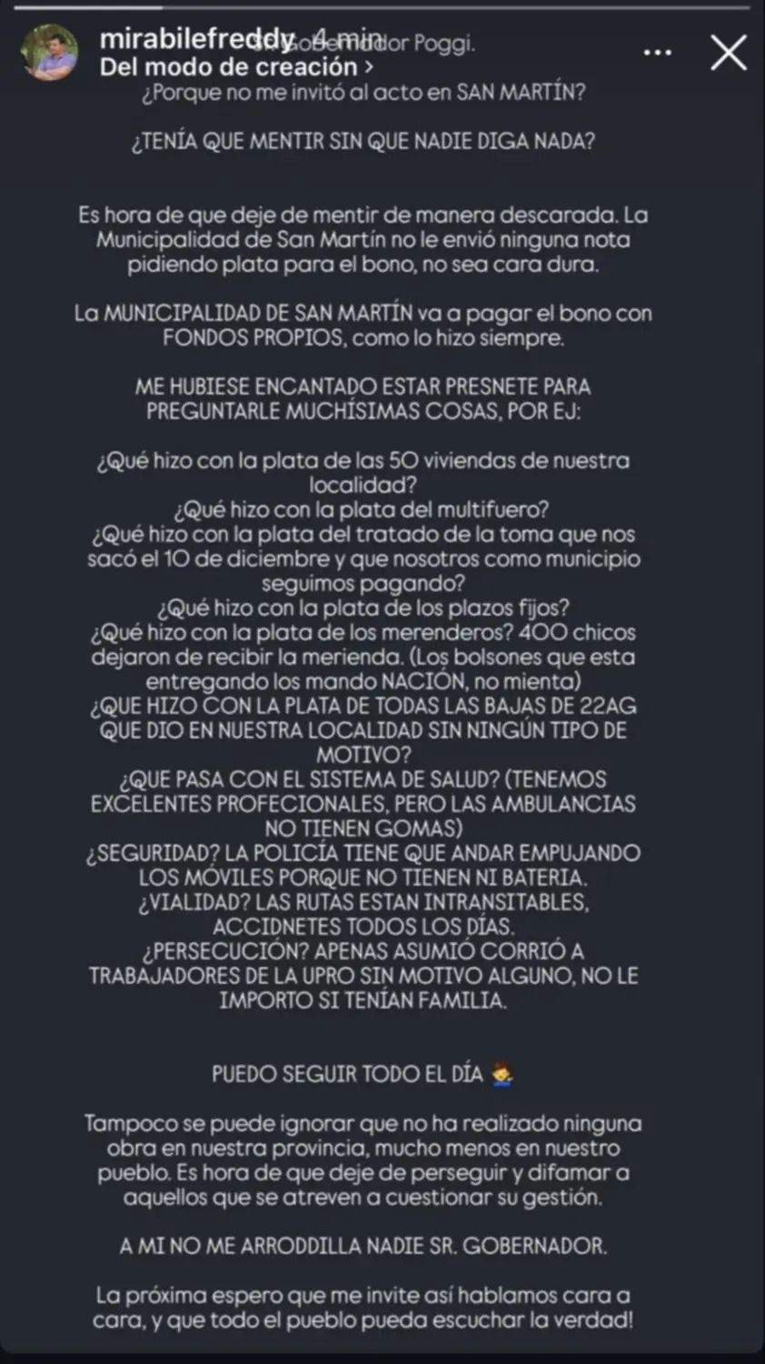 “Me hubiese encantado estar presente para preguntarle muchísimas cosas, por ejemplo: ¿Qué hizo con la plata de las 50 viviendas de nuestra localidad? ¿Qué hizo con la plata del Multifuero? ¿Qué hizo con la plata del Tratado de La Toma que nos sacó el 10 de diciembre y que nosotros como municipio seguimos pagando?”, preguntó Mirabile en su respuesta a los ataques del gobernador.