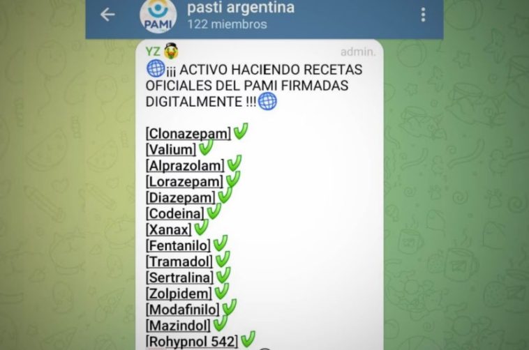 Denunciaron que en un grupo de Telegram venden recetas truchas del PAMI y psicofármacos potencialmente riesgosos si se usan sin control, como el fentalino, el tramadol y la codeína. El dinero, según las capturas compartidas en el chat, se transfiere por Mercado Pago para realizar la transacción.