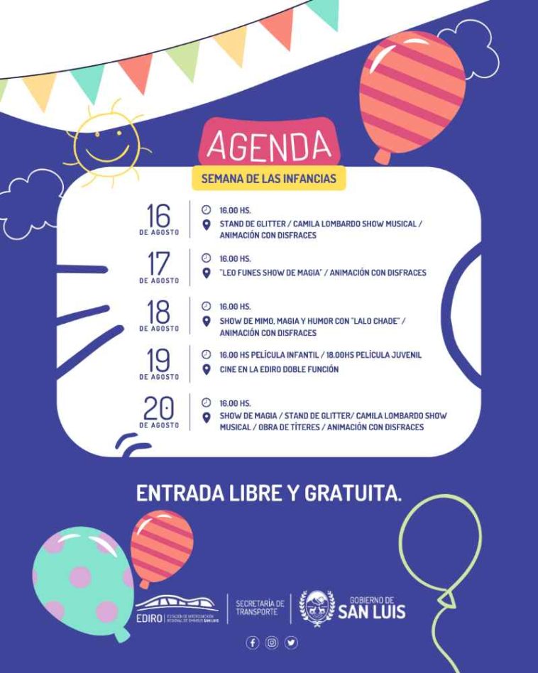 Del miércoles 16 al domingo 20 de agosto, con entrada libre y gratuita, las instalaciones de la Estación de Interconexión Regional de Ómnibus (EDIRO) se llenarán de magia y diversión para celebrar la “Semana de las Infancias”. Un evento dedicado a los más pequeños y sus familias, donde la alegría y la fantasía serán protagonistas.