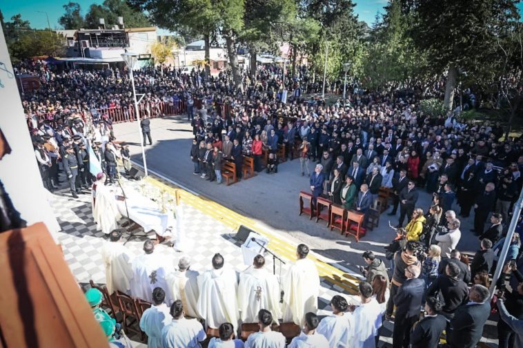 Entre aplausos, frente a la plaza principal ‘Lucia Soler’, fueron recibidos la vicepresidenta de la Nación, Victoria Villarruel; el gobernador, Claudio Poggi; el vicegobernador, Ricardo Endeiza y la intendenta, Rosa Calderón, quienes dos minutos antes de las 15:00 ingresaron a la nave principal de la Iglesia para recibir la bendición de monseñor Gabriel Barba.