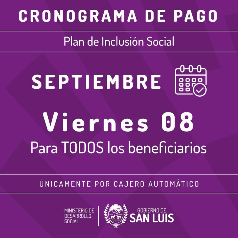 El viernes 8 de septiembre las beneficiarias y los beneficiarios de Inclusión Social cobrarán el pago correspondiente del mes de agosto. El beneficio se abonará el mismo día, es decir, terminaciones pares e impares de DNI lo harán la misma jornada.