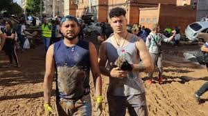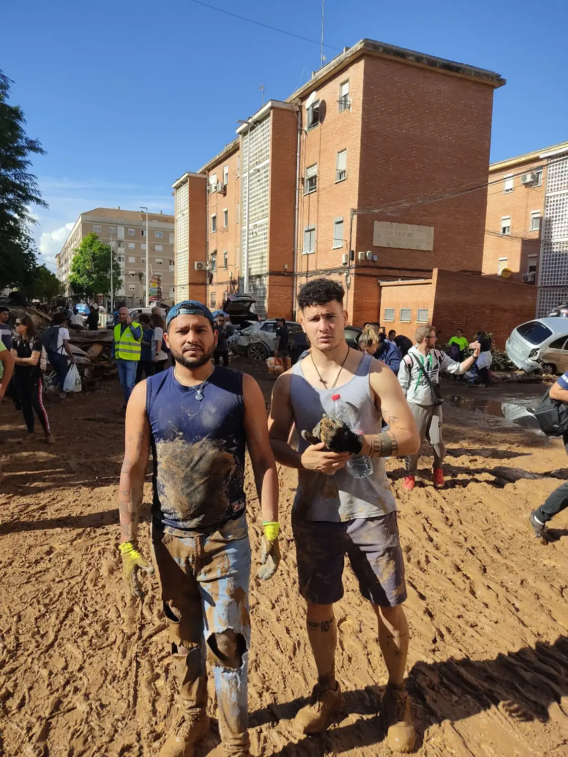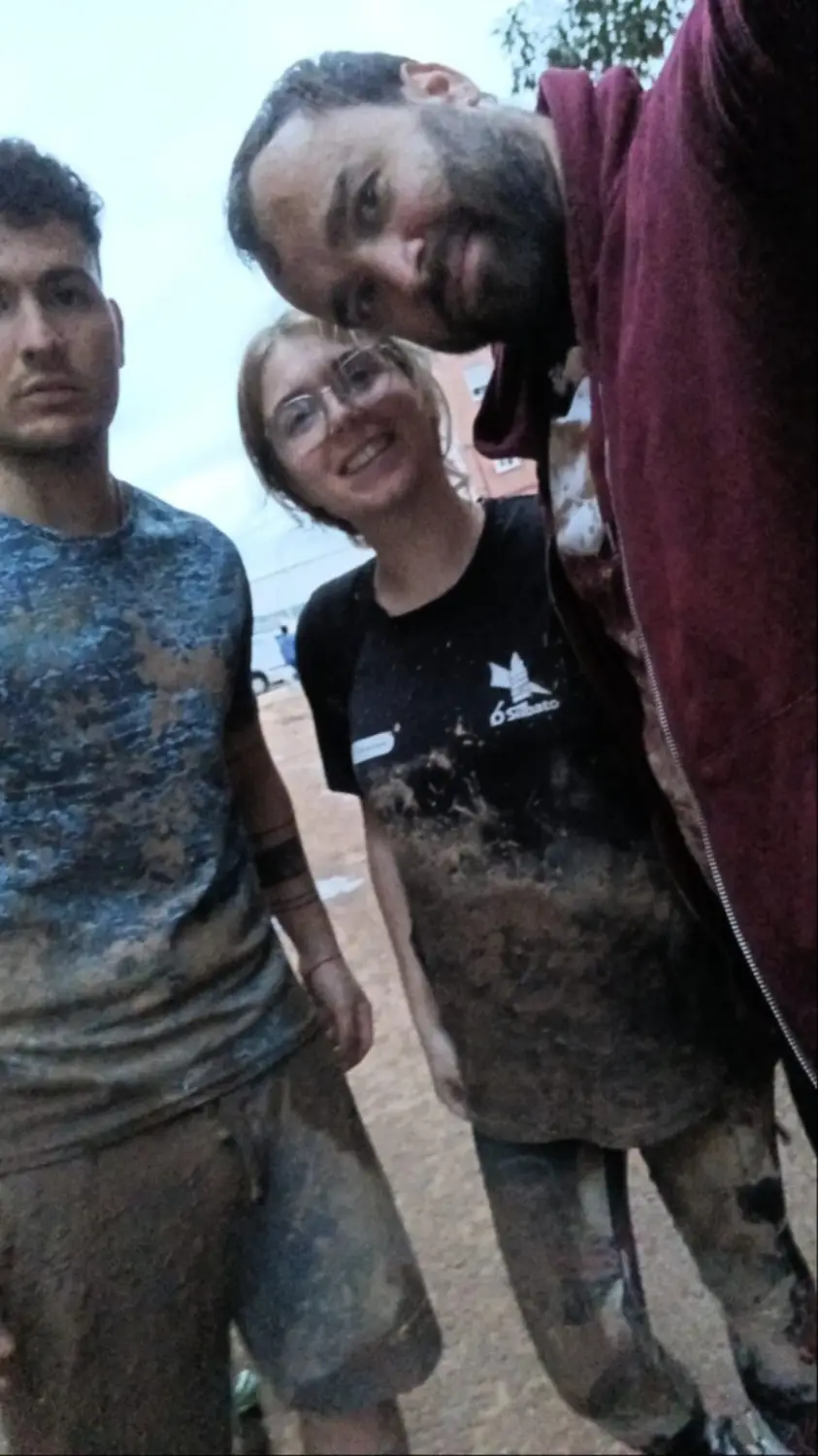 El barro en todos lados. Ezequiel, junto a una pareja rumana trabajando en las calles valencianas. Foto: Gentileza Ezequiel Carbajal