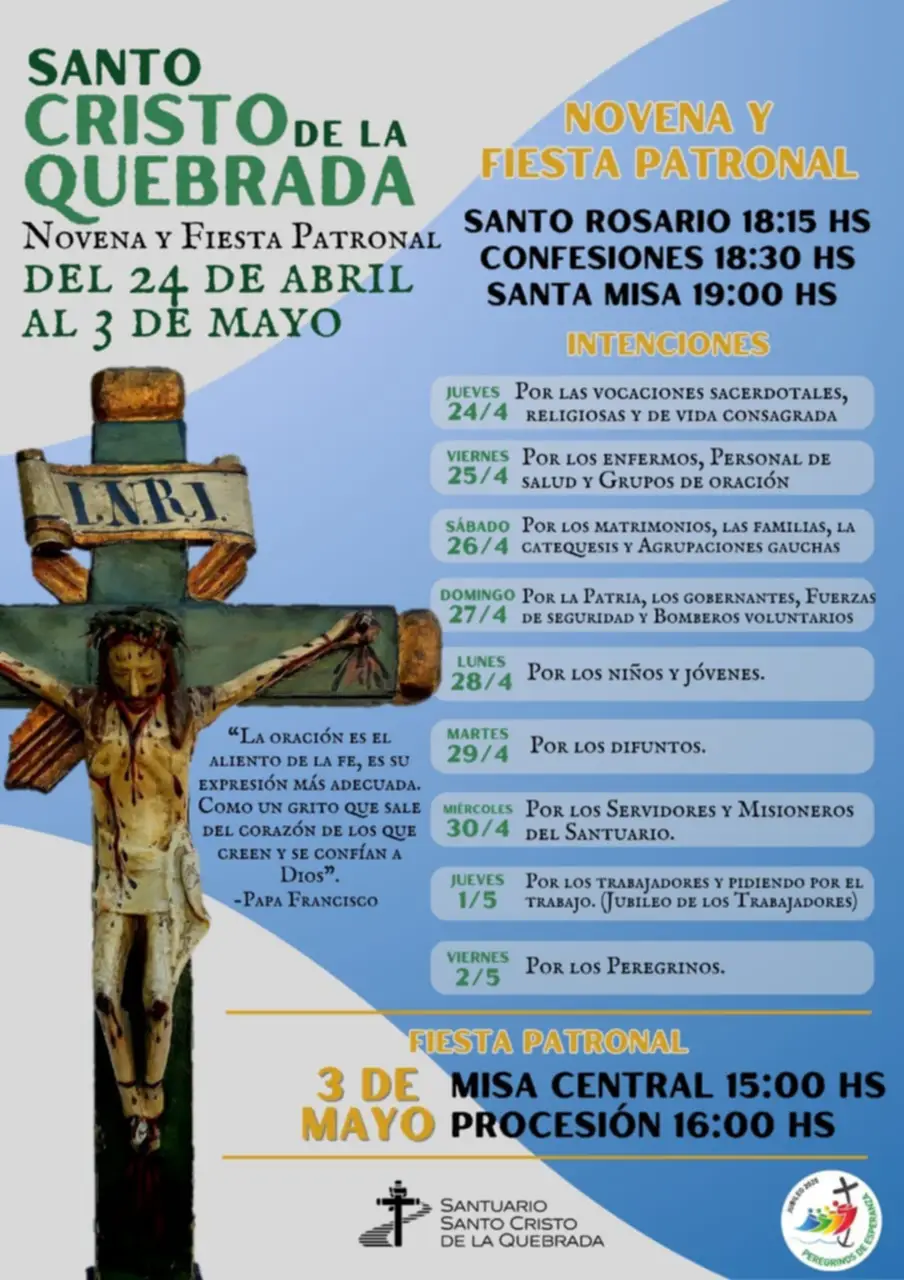 También recordó que el 30 de abril se rezará por los chicos que hacen misiones a instancias del Santuario, donde hablan sobre el Cristo de la Quebrada, escuchan a la gente, reparten los horarios de las mismas, se dedican al servicio del Santuario, reciben a los peregrinos, están atentos a las necesidades en las que se los pueda ayudar y, fundamentalmente, los reciben el 30 a la noche.