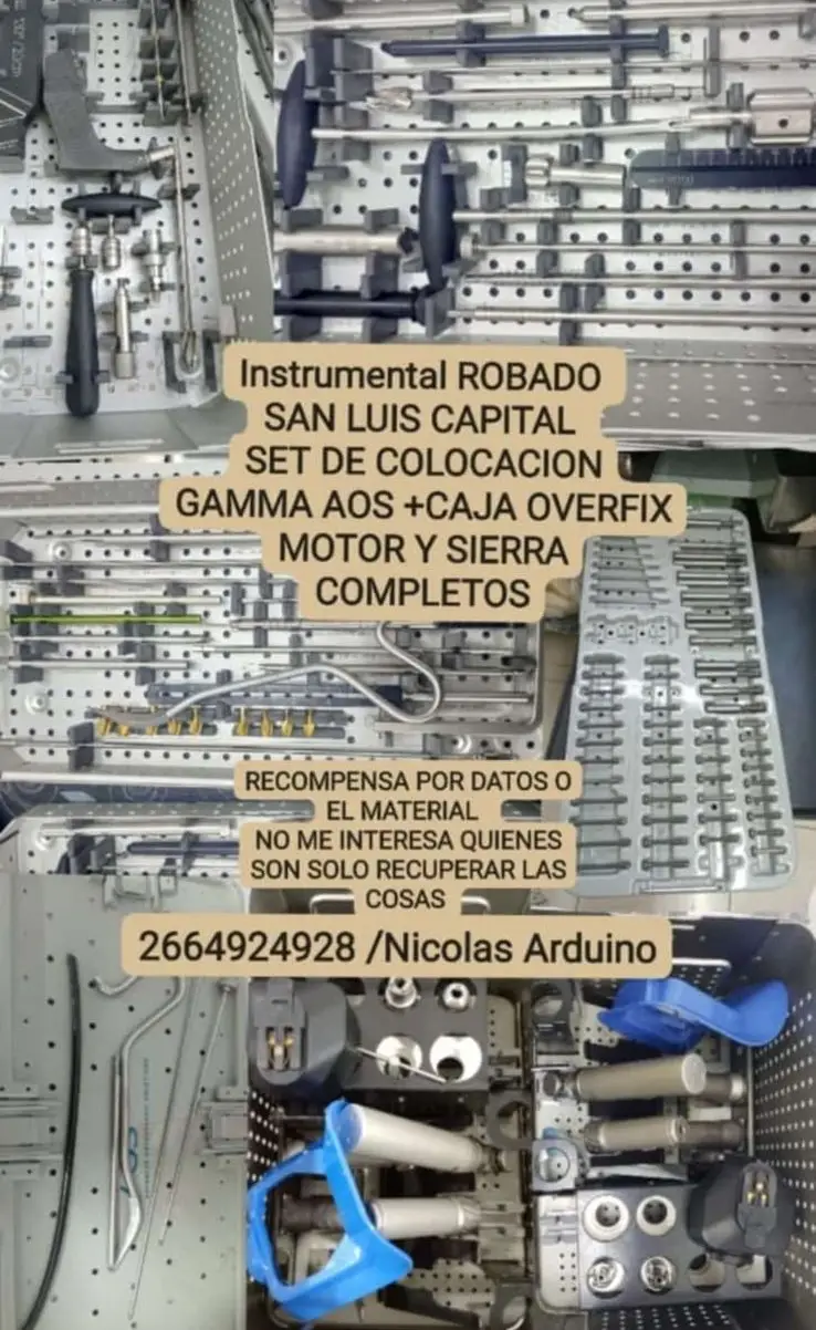 Una imagen del instrumental sustraído circula por redes sociales. En ella se detalla que se trata de un set Gamma AOS con caja Overfix, motor y sierra completos, y se ofrece recompensa a quien pueda aportar datos para recuperarlo. El teléfono de contacto es el 2664924928, a nombre de Nicolás Arduino.