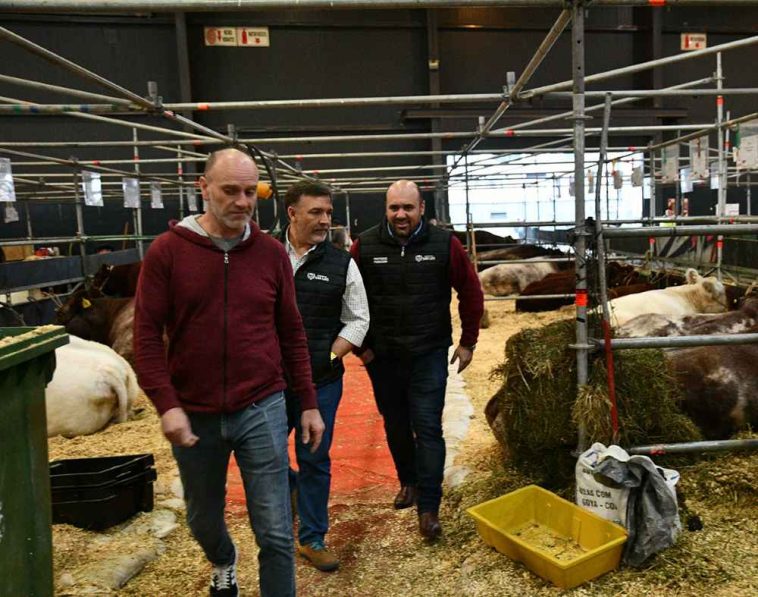 El ministro de Producción Marcelo Amitrano y el jefe del Programa Campo Fernando Videla, se entrevistaron con Héctor Eyherabide, titular de la cabaña Santa Lucía, quien presentó por primera vez en la Expo Rural un ejemplar de la raza Shorton Plus, una cruza de Shorthorn con Angus que da como resultado un animal muy manso con mejor calidad de carne y leche.