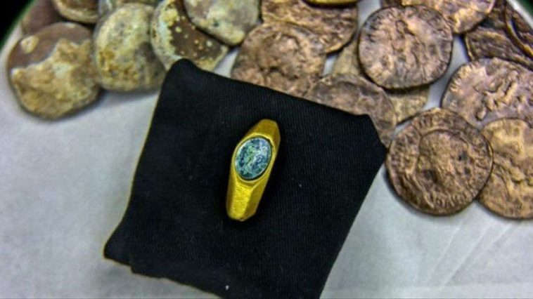 Entre centenares de objetos se destaca un anillo octogonal de oro, con una gema verde engarzada y grabada con la imagen de un joven pastor con túnica, con un carnero u oveja en sus hombros, que data del Imperio Romano y que por su tamaño estiman que “habría pertenecido a una mujer”.