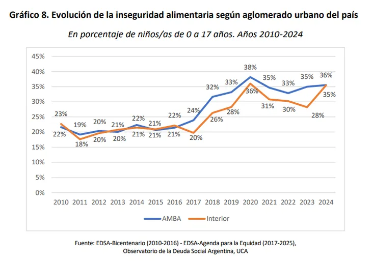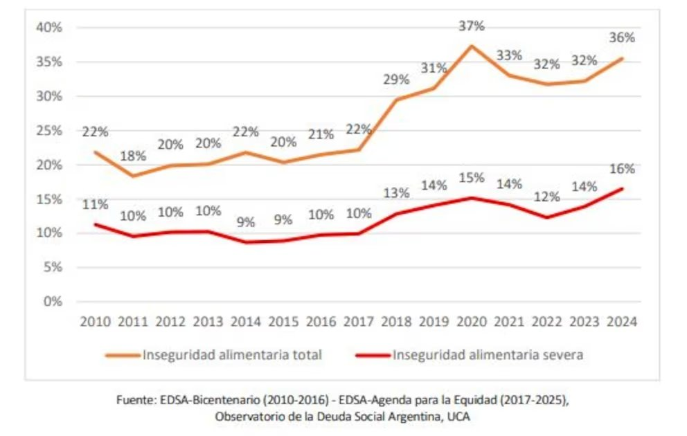 En Argentina hay 4 millones de chicos que no tienen garantizada su comida diaria, y tres de cuatro que atraviesan esa situación tienen padres y madres con trabajo. La cantidad de hogares que viven con inseguridad alimentaria creció del 32% en 2010 al 51% en 2024. Los datos surgen de un informe de la Universidad Católica Argentina (UCA).