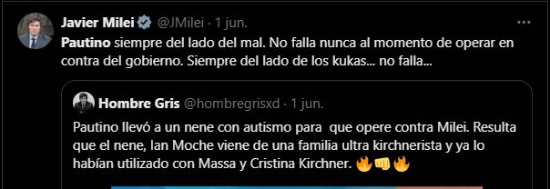 Recondo fue más allá al señalar que Ian Moche, al asumir un rol público en su militancia por la concientización sobre el autismo, quedó expuesto al escrutinio social. De todas formas, aclaró que en el tuit de Milei no hubo ataque alguno ni contra el niño ni contra la campaña en favor de la discapacidad.