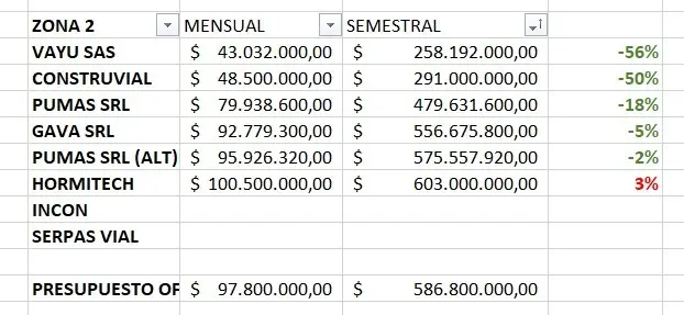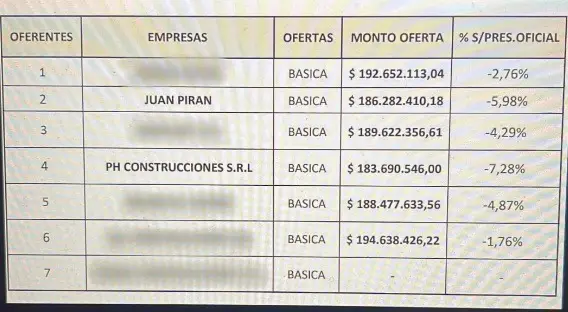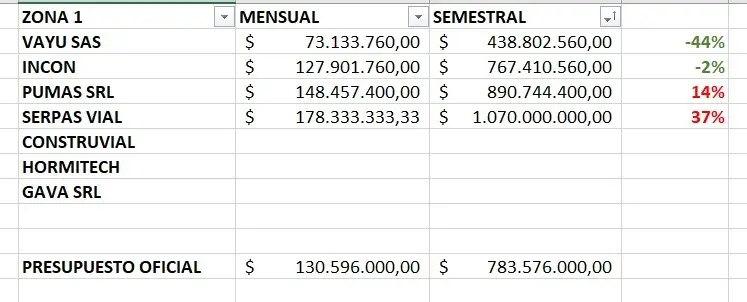 Como oferentes, se presentaron INCON S.A., PUMAS S.A., GAVA S.R.L., HORMITECH S.R.L., CONSTUVIAL SAN LUIS S.R.L., SERPAS VIAL S.A.S y VAYU S.A.S. La traza de los presupuestos se dividió en dos zonas. Pese a que hubo ofertas bastante bajas y convenientes, optaron valores más altos. En el caso de la zona 1, se adjudicó a INCON S.A. por $767.410.560,00 (semestral). Por la zona 2, quedó HORMITECH S.R.L., con un monto de $603.000.000,00 (semestral).