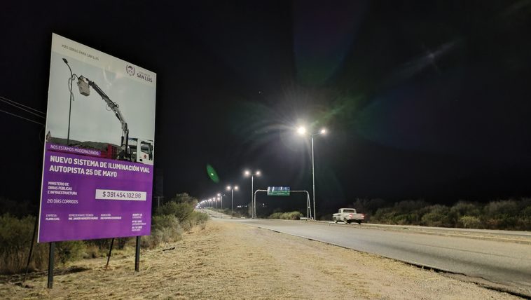 La mencionada obra se realizó sobre un tramo de 6 kilómetros de la autopista 25 de Mayo en diferentes etapas. Primeramente, se mejoraron luminarias en rotondas de acceso y de retorno entre las localidades de Los Molles y El Suyuque. Luego, se dio inicio a la instalación de postes y el correspondiente tendido eléctrico a lo largo de 6 km entre ambas localidades, en un sector donde no había iluminación.