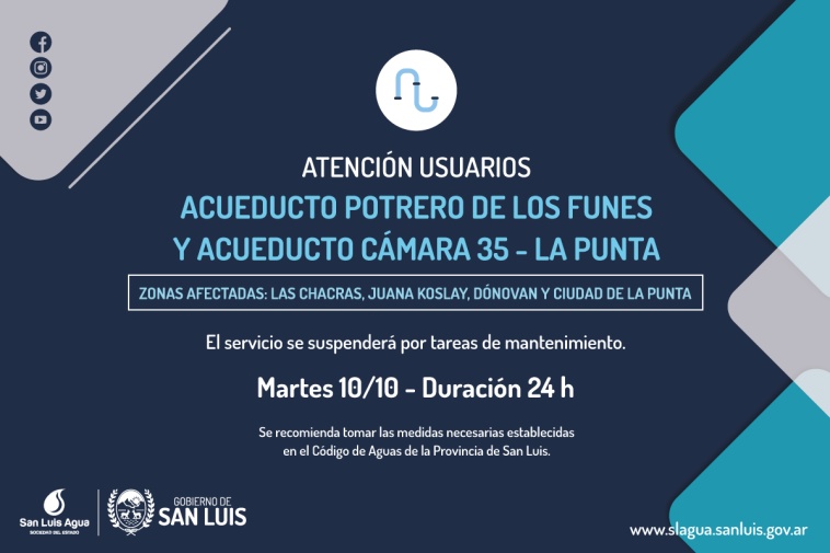 “Realizaremos dos intervenciones simultáneas en los acueductos Potrero de los Funes y Cámara 35-La Punta, con el fin de llevar a cabo tareas de mantenimiento en ambos sistemas y mejoras en la regulación. Dichos trabajos requieren de trabajos en seco, por lo que debemos suspender el suministro del recurso por un lapso de 24 horas”, explicó Martín Manoni, gerente operativo de San Luis Agua.