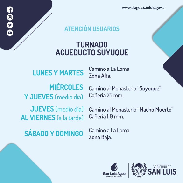 “Realizamos modificaciones en el turnado de agua cruda del acueducto Suyuque, debido al bajo caudal que transporta el arroyo que lleva el mismo nombre, y con el objetivo de hacer entregas equitativas del recurso. La nueva disposición regirá a partir de este miércoles 13 de septiembre y se extenderá hasta nuevo aviso”, explicó Martín Manoni, gerente operativo de San Luis Agua.