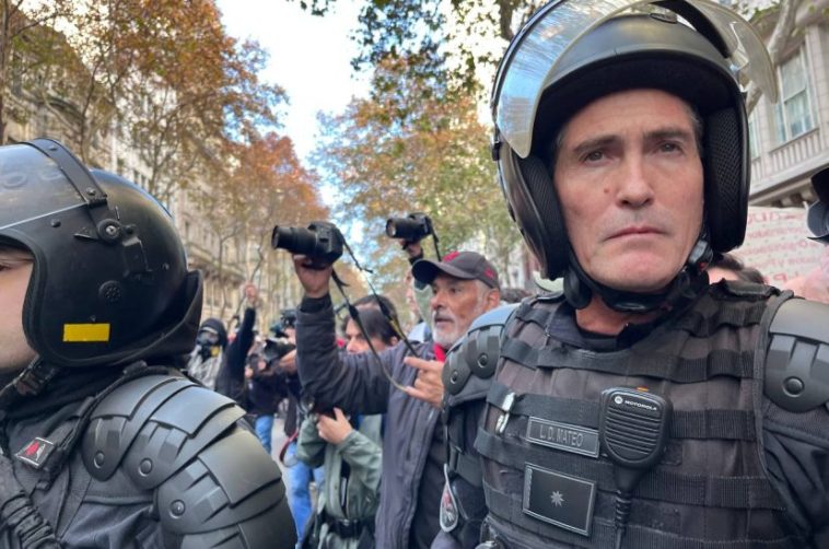 Las calles están valladas, principalmente Hipólito Yrigoyen y Sarandí, la avenida Entre Ríos y Alsina, Callao y Bartolomé Mitre. En Congreso las Fuerzas de Seguridad activaron el protocolo antipiquetes de Bullrich y comenzaron a reprimir a grupos de manifestantes que se trasladaban hacia Plaza de Mayo para unificar protestas.