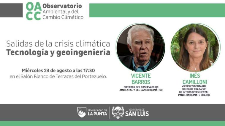 La Universidad de la Punta invita al público en general interesado en el cambio climático a la presentación que dará el director del Observatorio Ambiental y del Cambio Climático, Vicente Barros, junto a la vicepresidenta del Grupo de Trabajo del Intergovernmental Panel on Climate Change (IPCC), Inés Camilloni. La charla será este miércoles 23 de agosto, a las 17:30, en el Salón Blanco de Terrazas del Portezuelo.
