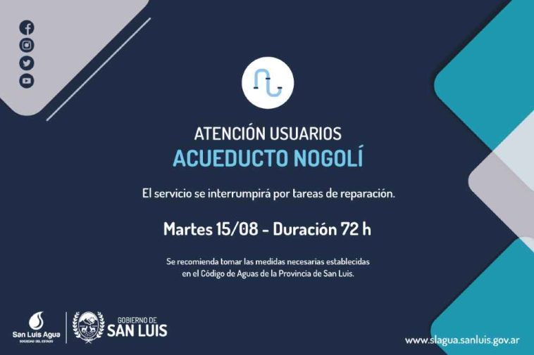 Claudio Tardieu, subgerente de Acueductos de San Luis Agua, comentó: “Suspenderemos el suministro de agua cruda en el Acueducto Nogolí, por tareas de reparación en el mismo. Estas tendrán una duración de 72 horas aproximadamente en total para normalizar su funcionamiento, contando con la regulación y el purgado del sistema”.