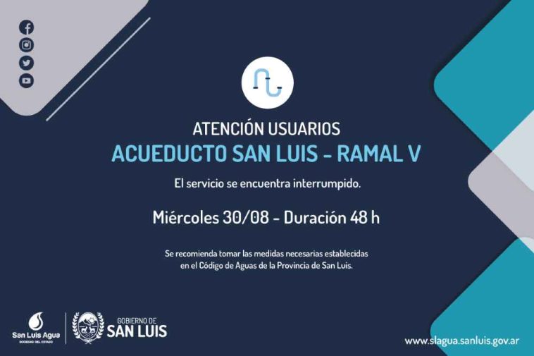 Claudio Tardieu, subgerente de Acueducto de San Luis Agua, comentó: “Realizamos la reparación del Acueducto San Luis en el Ramal V, el cual afectó el suministro y funcionamiento del sistema. Ya se encuentra finalizada la reparación, por lo tanto, el día viernes se encontrará restablecido después de realizar las maniobras de apertura, regulación y purgado de todo el acueducto”.