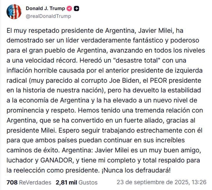 Y remató en su cuenta de Truth Social: “Hemos tenido una relación extraordinaria con Argentina, que se ha convertido en un fuerte aliado gracias al presidente Milei. Espero seguir trabajando estrechamente con él para que nuestros dos países puedan continuar por su increíble camino hacia el éxito. Argentina: Javier Milei es un muy buen amigo, luchador y GANADOR, y cuenta con mi apoyo total y absoluto para su reelección como presidente. ¡Nunca les defraudará!}“.